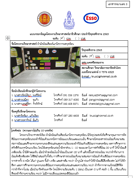 แบบกรอกข้อมูลโครงงานวิทยาศาสตร์อาชีวศึกษา ประจำปีพุทธศักราช 2565